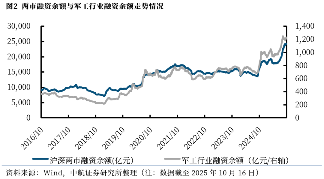 截至2025年10月16日,军工行业的融资余额合计1230.50亿元,比上周环比增加1.97%,占两市融资余额比例为5.06%。