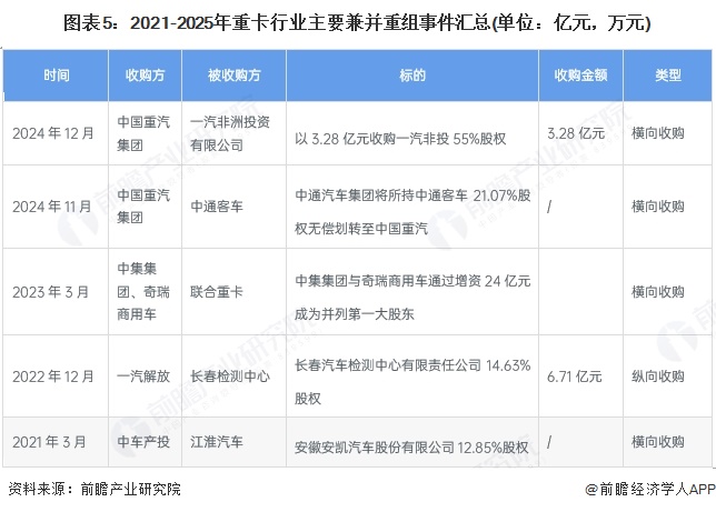 随着重卡行业的不断发展,行业内企业兼并重组活动偶有发生。2021-2025年,中国重卡行业兼并重组事件主要是通过收购以满足企业纵向一体化或横向扩张经营的需求。
