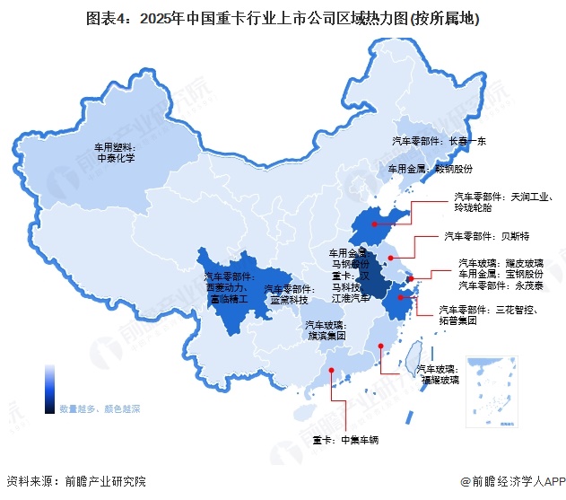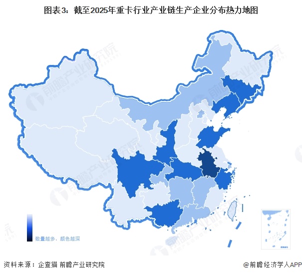 重卡行业产业链区域热力地图:安徽分布最集中从我国重卡产业链企业区域分布来看,中国重卡企业较为分散,其中安徽分布最为集中;总体来看,重卡产业生产企业地域分布较为分散,以湖北、安徽和浙江为代表长江流域行业分布较为集中。