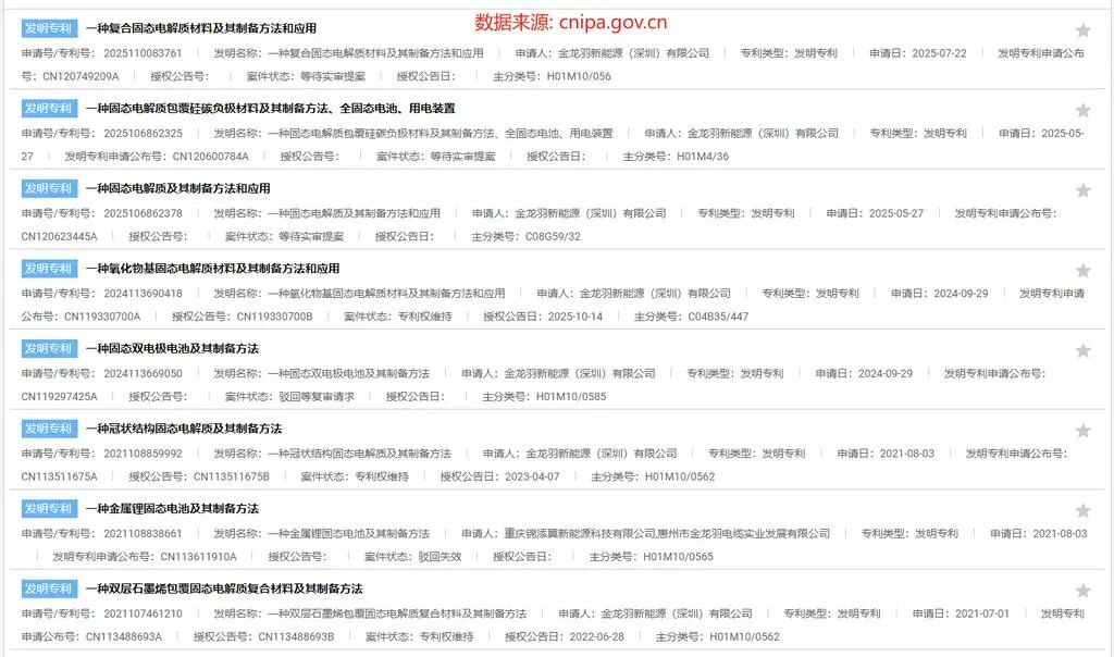 3、知识产权:目前,金龙羽已拥有多项固态电池相关授权发明专利,覆盖电解质、负极、正极等核心技术,构建了初步的知识产权壁垒。