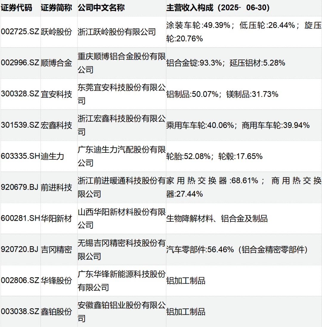 根据Wind提供的最新数据,以下是以铝合金为主营业务的部分上市公司(截至2025年6月30日):