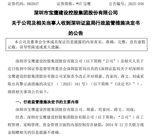 据公告,*ST宝鹰在工程管理、采购管理、资金管理方面的内部控制存在缺陷,2024年12月关联方现金捐赠相关的信息披露不准确。深圳证监局据此决定,对*ST宝鹰采取责令改正的监管措施。