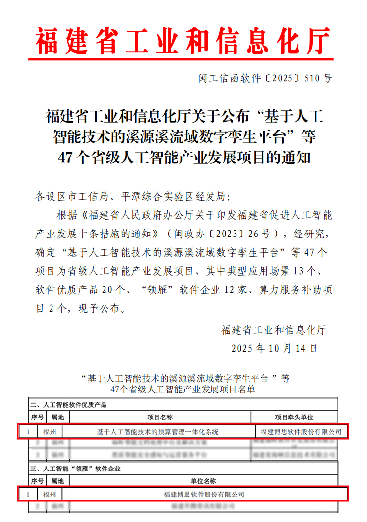 近日,福建省工业和信息化厅正式公布了省级人工智能产业发展项目名单,博思软件凭借在人工智能方面的创新研发与场景应用,成功获评“福建省人工智能‘领雁’软件企业”称号;同时,“基于人工智能技术的预算管理一体化系统”获评“福建省人工智能软件优质产品”,博思AI实力再获权威肯定。