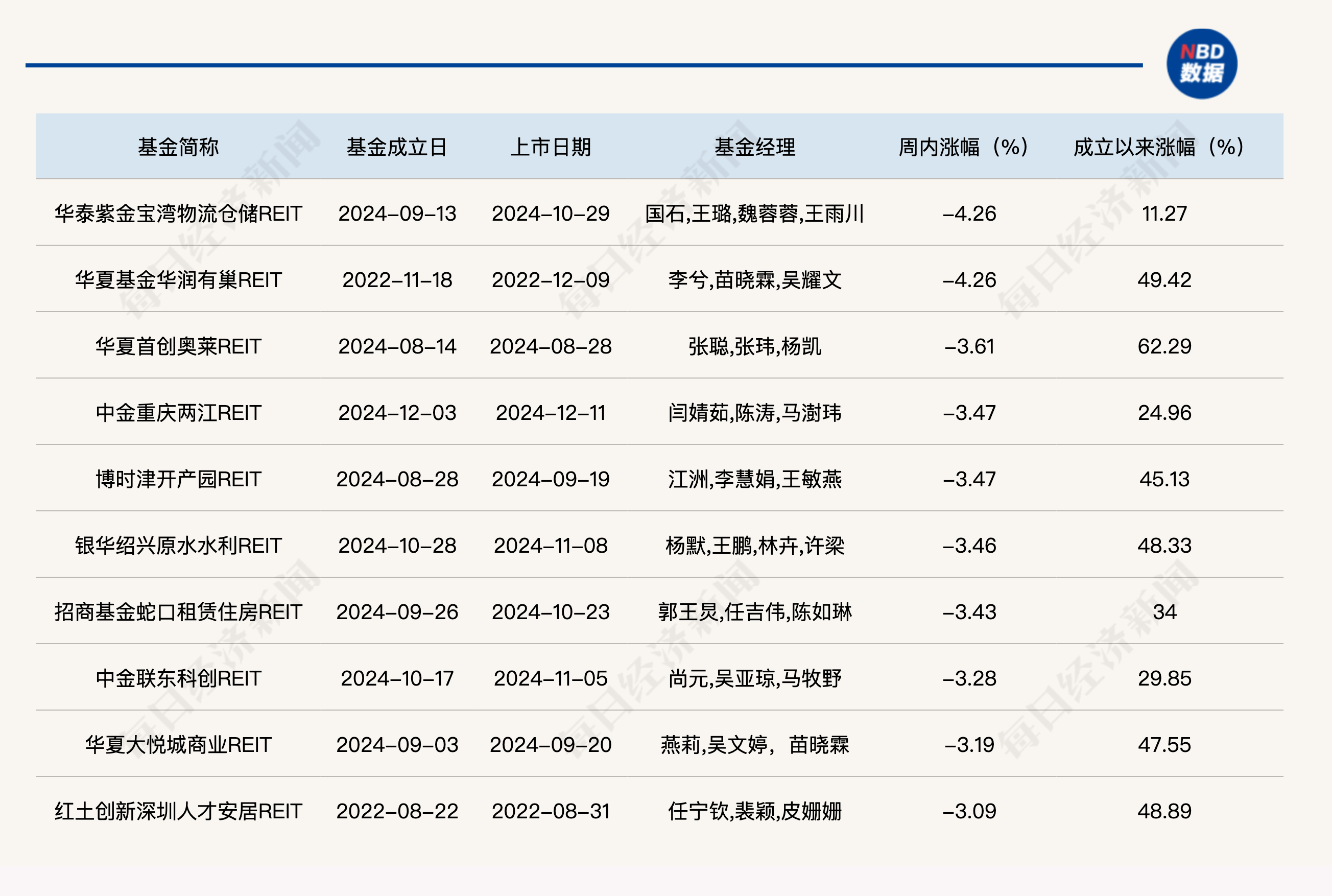 上周涨幅排名前十的公募REITs