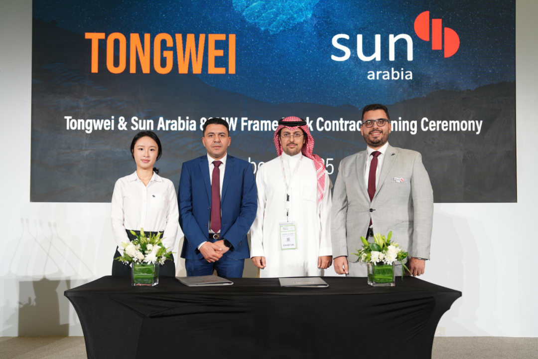 同日,通威股份官微发布消息称,10月12日至14日,在沙特阿拉伯利雅Solar & Storage KSA 2025期间,通威股份与沙特本地绿色能源解决方案提供商Sun Arabia正式签署80MW高效组件供货协议。