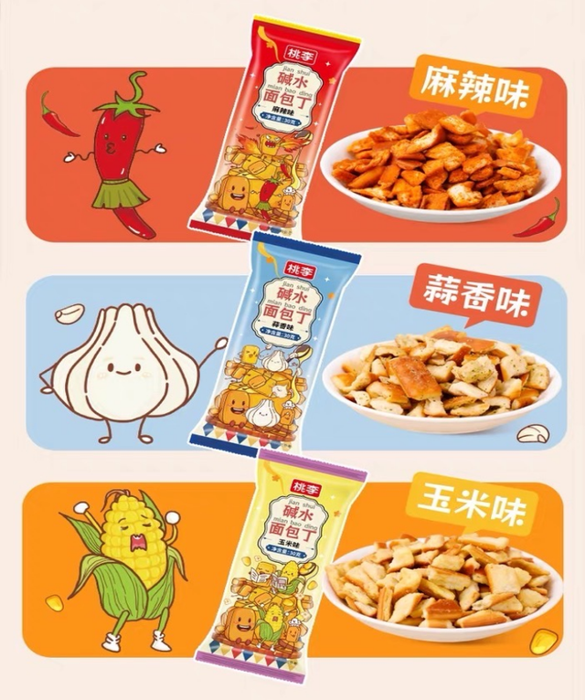 在零食产品领域,桃李面包推出碱水面包丁系列,以三款差异化风味为消费者带来别样美味体验。蒜香味碱水面包蒜香浓郁,点缀葱碎后香气四溢,入口醇厚香浓;玉米味碱水面包丁散发玉米香,香气醇厚浓郁,入口酥脆香甜;麻辣味碱水面包丁兼具麻辣咸香,实现香辣酥脆与香浓不腻的平衡。这些不同口味的碱水面包丁成为消费者日常休闲、办公休憩等不同场景下的零食新选择。
