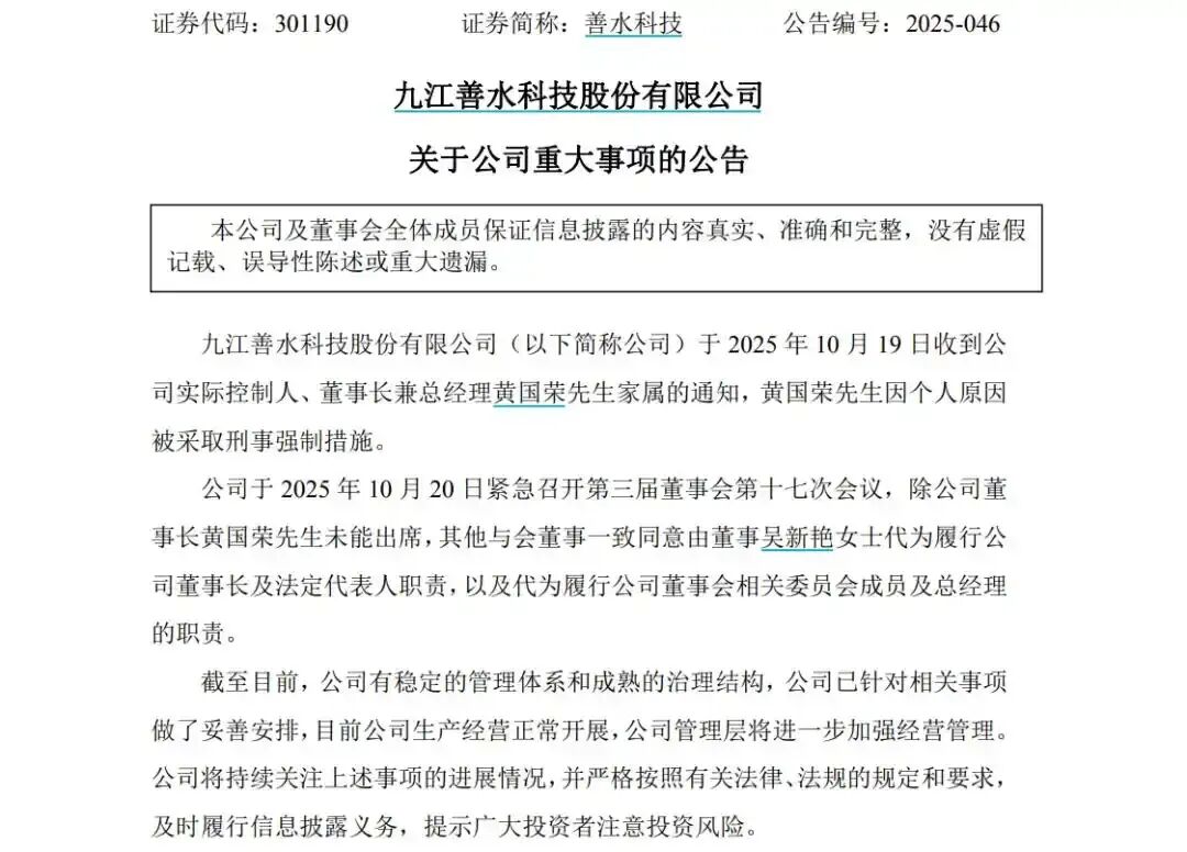 善水科技表示,公司已召开董事会会议,由董事吴新艳代为履行董事长及法定代表人职责,以及代为履行董事会相关委员会成员及总经理职责。目前公司生产经营正常,管理层将加强经营管理。截至目前,公司有稳定的管理体系和成熟的治理结构,公司已针对相关事项做了妥善安排,目前公司生产经营正常开展,公司管理层将进一步加强经营管理。