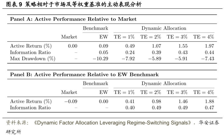图表9展示了2007年至2024年测试期间内,动态多因子投资组合相对于市场和等权重基准投资组合的主动表现。在整个表现评估期间,买卖交易均收取5个基点的交易成本。在Panel A中,所有表现指标均相对于市场展示,等权重基准显示出微不足道的正主动收益和信息比率(IR)。动态配置显著提高了主动收益和信息比率,信息比率从0.05提高到最高0.44。此外,相对于市场的最大回撤从-10%降低到-6%。在Panel B中,当相对于等权重基准评估表现时,的动态配置实现了约0.4至0.5的信息比率,表明相对于等权重基准具有稳健的超额表现。