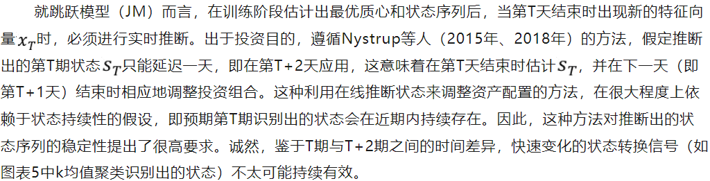需要明确区分因子状态分析与因子择时。二者的关键区别在于,状态分析作为一种无监督算法,其解释性特征与择时策略的预测性特征形成鲜明对比。择时策略试图直接将每个时期结束时已知的特征与未来因子表现联系起来,而状态识别模型则在训练阶段根据每个时期结束时观察到的特征,将所有历史时期分类为同质的子集群,不涉及对未来收益的预测监督。在完成样本内学习过程后,结合状态持续性的核心假设,采用在线推断算法进行实时应用。其目标是,每个时期结束时所识别的状态将在近期持续存在,而不会频繁转换。正如Nystrup等人(2015)所总结的,基于状态策略的目的是“并非预测状态转换或未来市场走势,而是识别状态转换何时发生,进而利用均衡收益和波动率的持续性获利”。