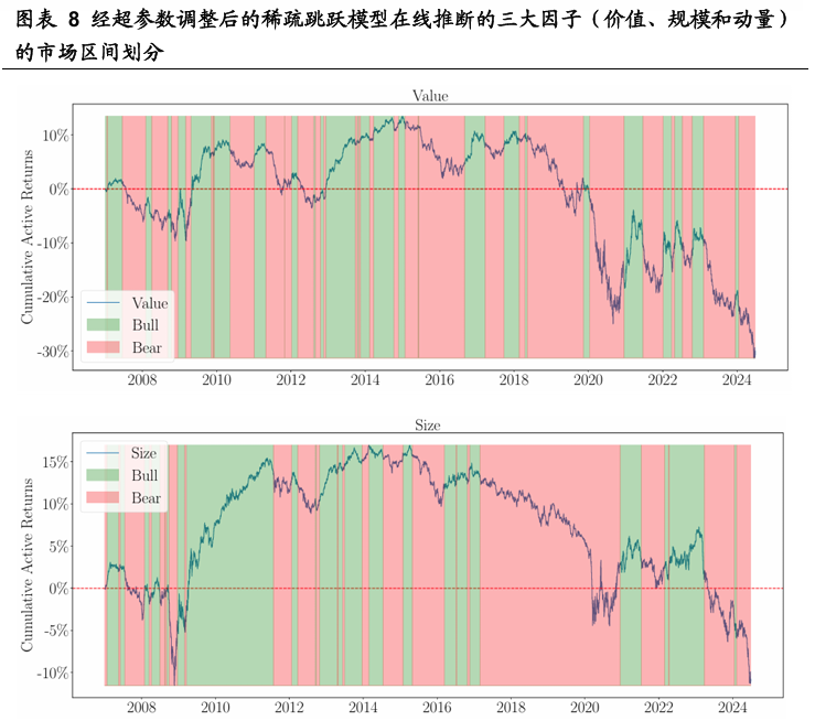 为更好地阐释稀疏跳跃模型(SJM)的机制,并便于与基准模型进行对比,以近期12年(2012年6月至2024年6月)的训练窗口为例,对价值因子进行模型拟合分析。图表5展示了三种模型(稀疏跳跃模型、隐马尔可夫模型(HMM)和k均值聚类)在样本内的拟合状态结果,图表6则呈现了稀疏跳跃模型拟合中每个特征维度在两种市场状态下的特征权重及对应的最优质心值。根据各状态在所有训练期内累计主动收益率的差异来区分牛市和熊市状态。稀疏跳跃模型和k均值聚类均采用图表4所述特征进行估计,其中稀疏跳跃模型的超参数设为典型值,而隐马尔可夫模型则以每日主动收益率为输入进行拟合。