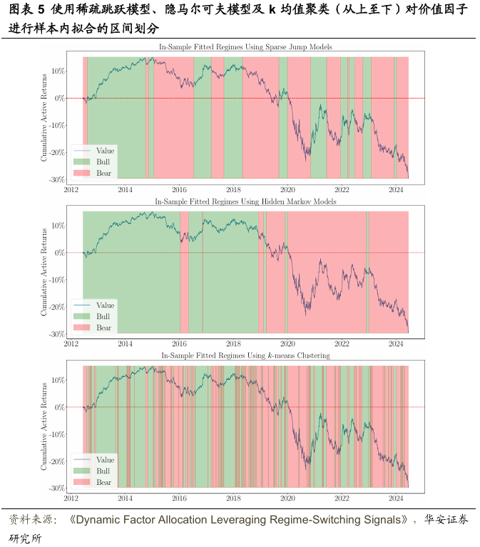 从图表中可以看出,稀疏跳跃模型准确捕捉了价值因子表现持续优异和不佳的时期,包括全球金融危机(GFC)后的反弹、新冠疫情市场崩盘后的近期暴跌,以及2023年以来的高利率环境。此外,该模型还识别出了这几次熊市之间的一些反弹行情。这种持续性表现与k均值聚类形成了鲜明对比,后者由于未考虑时间一致性,导致状态转换次数过多,显得不切实际。稀疏跳跃模型可视为对k均值拟合结果的有效平滑,且通过特征加权程序得到了进一步优化。至于隐马尔可夫模型,由于因子表现中牛市和熊市的平衡性,其缺乏持续性的问题不像应用于市场指数时那样突出。尽管如此,该模型仍存在一些短期状态转换,若忽视这些转换,模型将主要显示2019年前为牛市、之后为熊市,从而忽略了许多市场动态和潜在机会。
