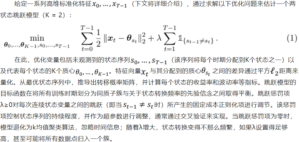 文献研究采用统计跳跃模型(Jump Model,JM)的稀疏版本作为状态识别模型。尽管机器学习聚类算法(如用于检测市场风险状态的k均值聚类算法,DiCiurcio等人(2024)在金融应用中已广受欢迎,但由于跳跃模型通过为隐藏状态序列中的每次转换引入明确的跳跃惩罚项来纳入时间信息,因此该模型尤其适用于时间序列数据。这种方法考虑到了金融状态的内在持续性,并提高了所识别状态的解释性,因为市场参与者通常不会预期状态频繁转换。Bosancic等人(2024)近期展示了跳跃模型在仅做多因子投资组合的状态分析中的成功应用。