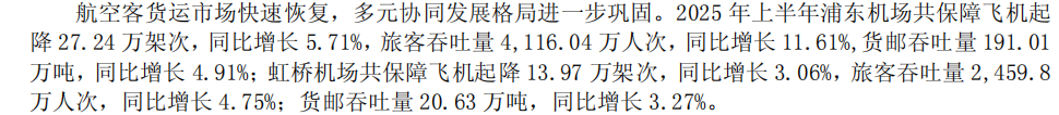 2025 年上半年浦东机场共保障飞机起降 27.24 万架次,同比增长 5.71%,旅客吞吐量 4,116.04 万人次,同比增长 11.61%,货邮吞吐量 191.01万吨,同比增长 4.91%;