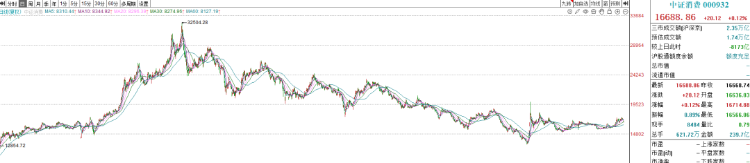 那么为什么免税收入大大低于预期,答案很简单,就是整个社会的消费环境非常低迷,看看中证消费指数,基本都是趴在地下。