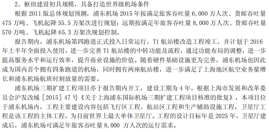 根据2011版总体规划预测,浦东机场2015年按满足旅客吞吐量6,000万人次、货邮吞吐量475万吨、飞机起降55.5万架次进行规划;远期按满足年旅客吞吐量8,000万人次、货邮吞吐量570万吨、飞机起降65.3万架次规划控制。