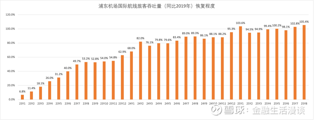 看下图,2025年浦东机场国际航线旅客吞吐量基本已经完成恢复到2019年,接下来就是看上海机场的消费恢复情况。