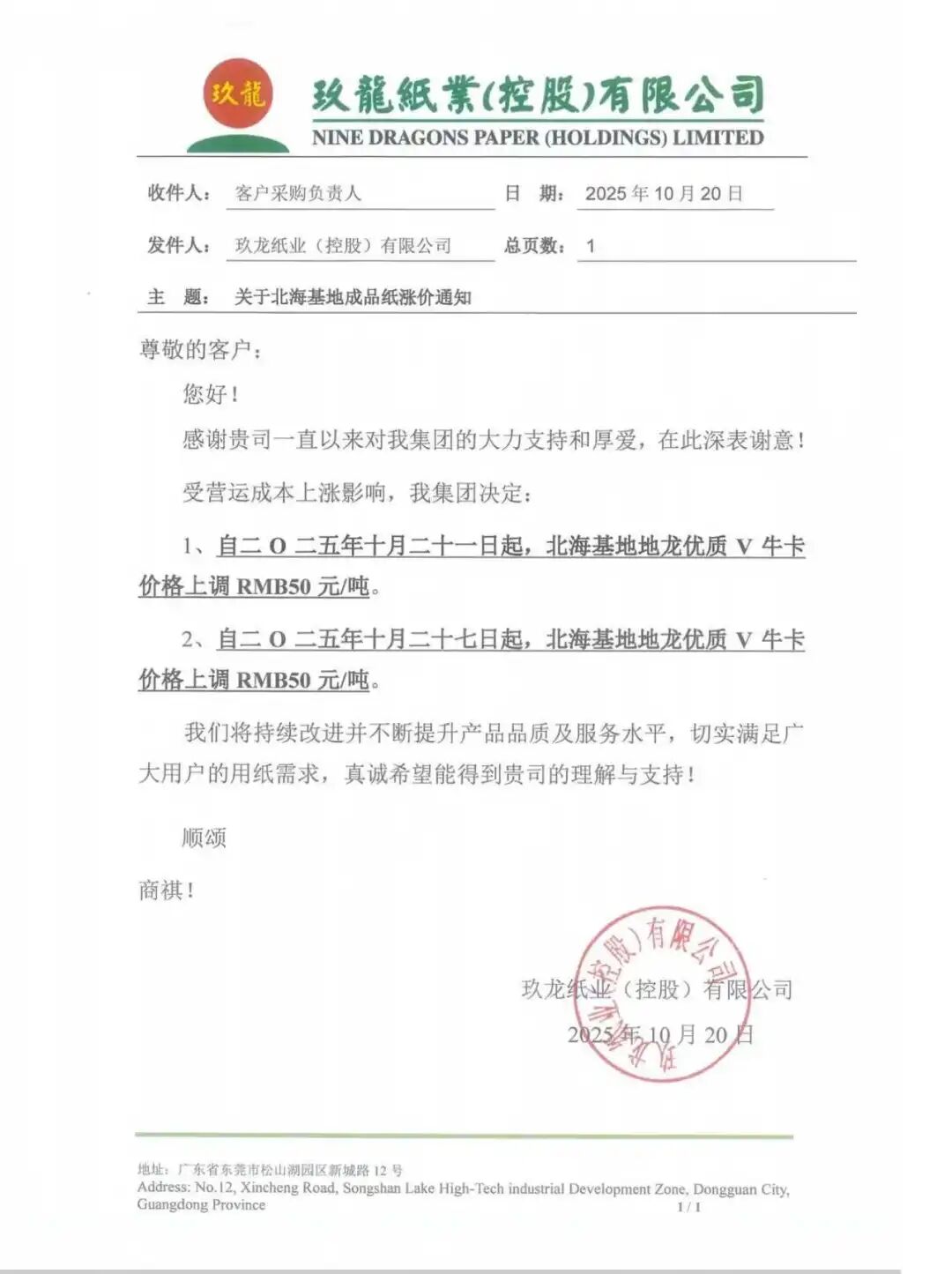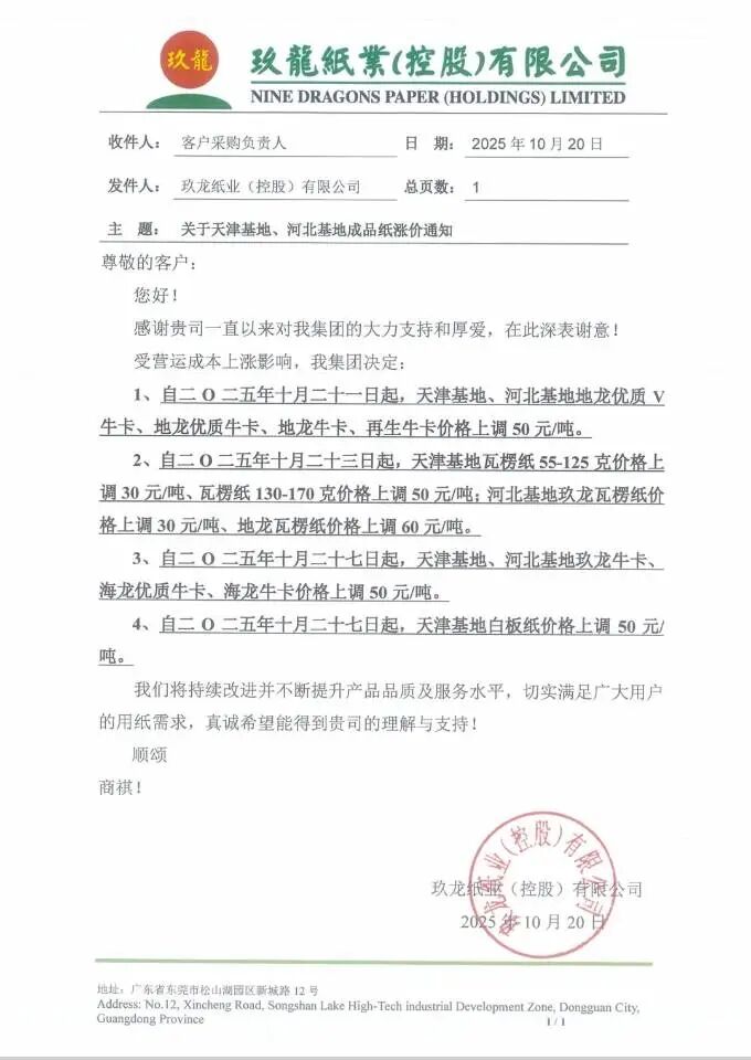 1、自10月21日起,湖北基地玖龙优质牛卡、海龙优质牛卡系列、海龙牛卡、地龙优质牛卡系列、地龙牛卡、再生牛卡系列价格上调RMB 50元/吨。