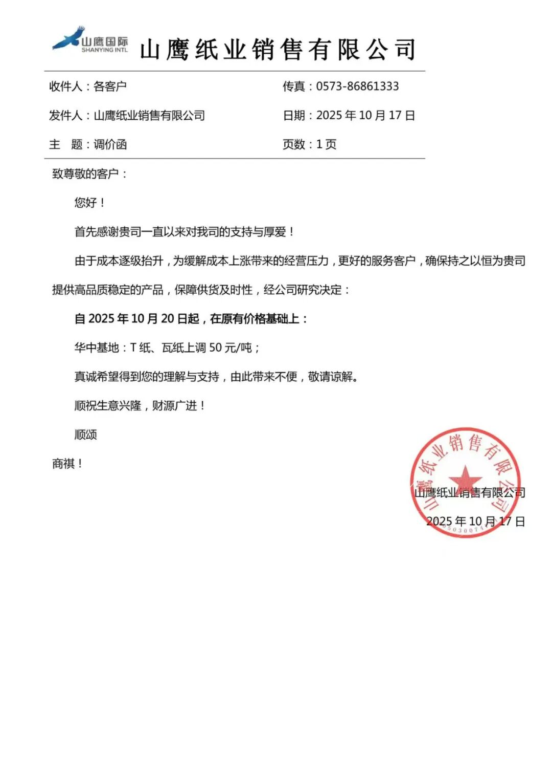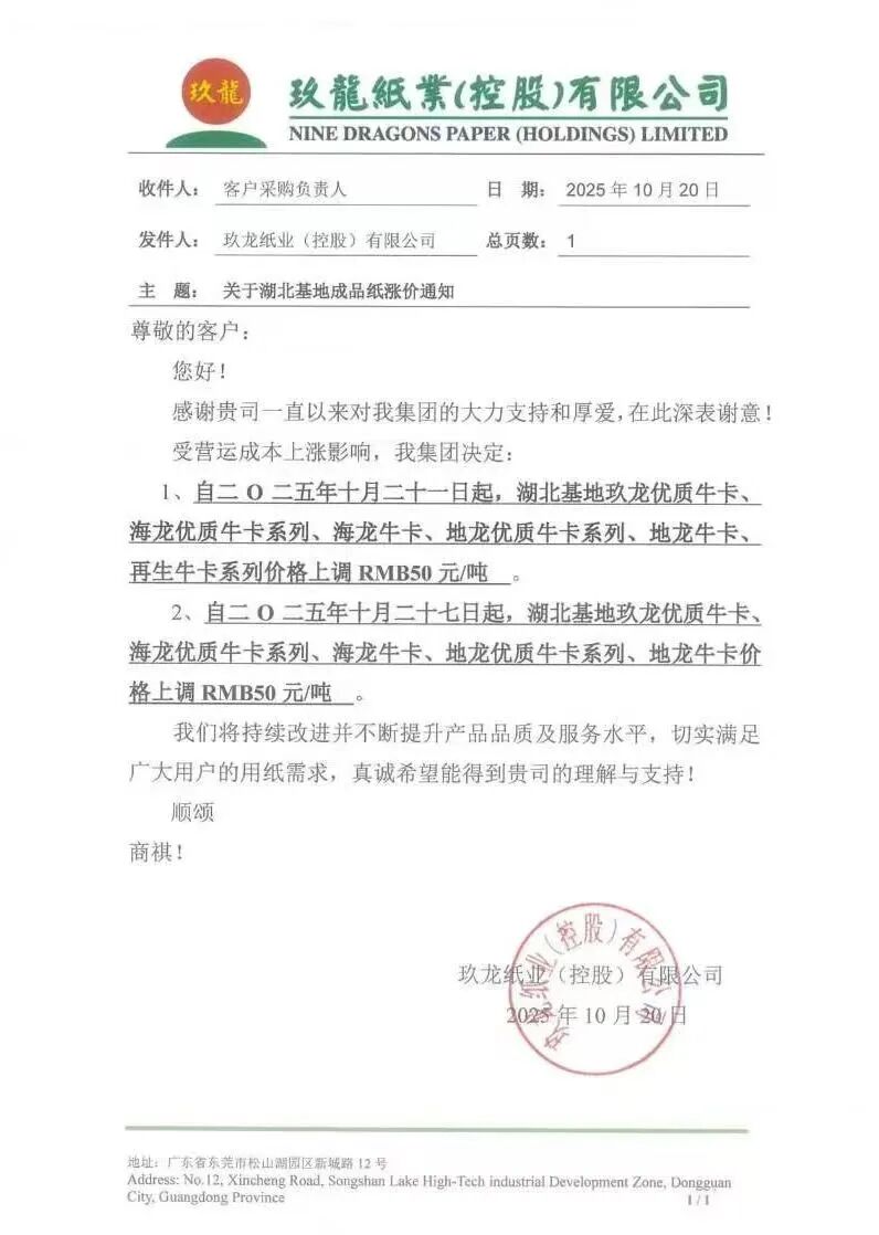 2、自10月27日起,湖北基地玖龙优质牛卡、海龙优质牛卡系列、海龙牛卡、地龙优质牛卡系列、地龙牛卡价格上调RMB 50元/吨。