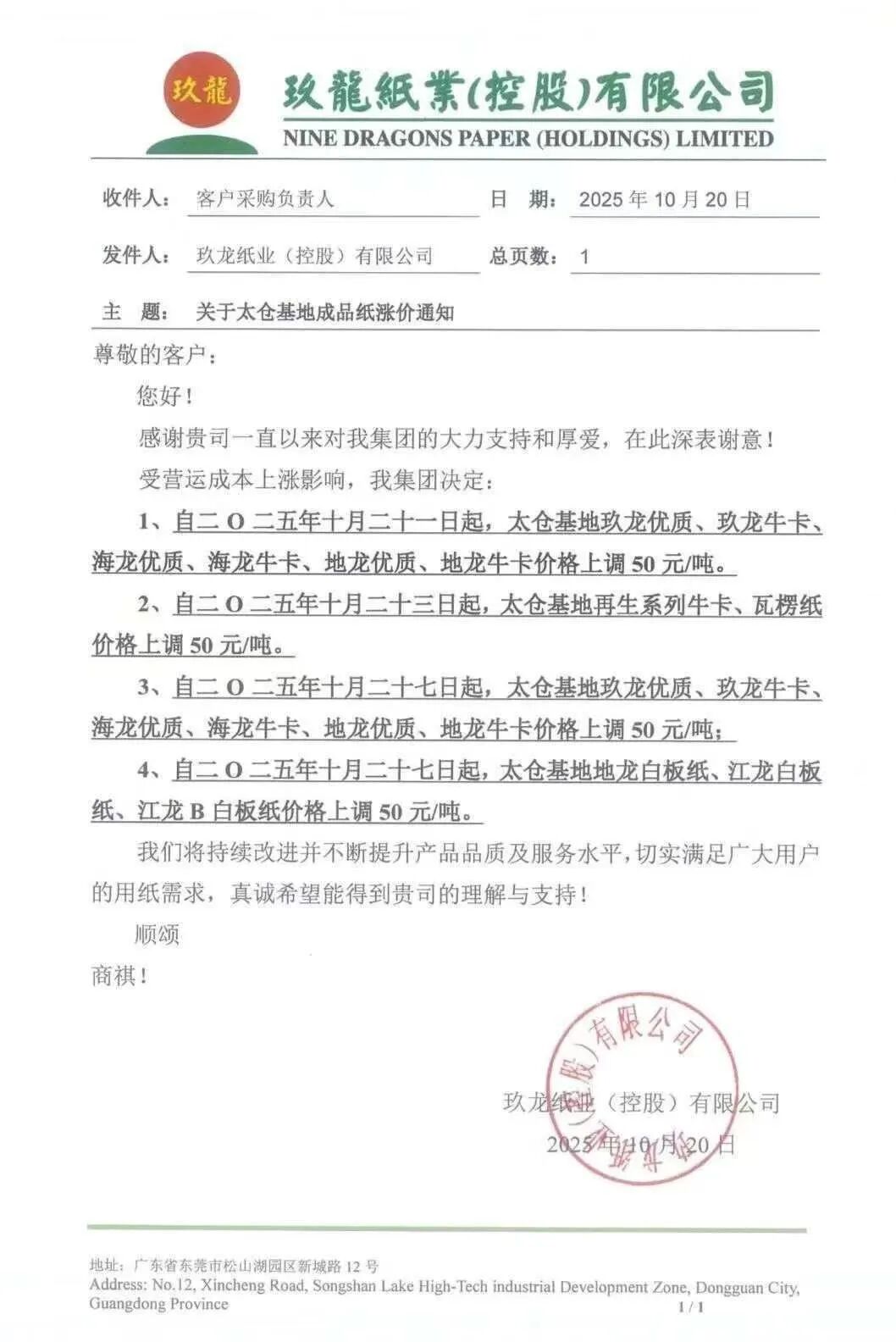 1、自10月21日起,太仓基地玖龙优质、玖龙牛卡、海龙优质、海龙牛卡、地龙优质、地龙牛卡价格上调50元/吨。