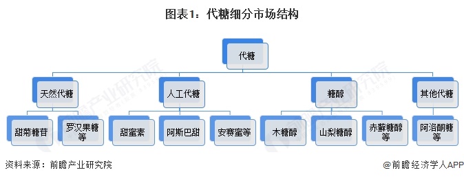 “代糖”通常是指替代蔗糖、果糖、葡萄糖、麦芽糖、乳糖发挥甜味作用的甜味剂。代糖能产生甜味,但是热量很低或是无热量,一般被分为人工代糖、天然代糖、糖醇和其他代糖。常见的人工代糖包括甜蜜素、阿斯巴甜等;常见的天然代糖包括甜菊糖苷、罗汉果糖等;糖醇主要有赤藓糖醇、木糖醇、山梨糖醇等,其他代表主要有阿洛酮糖等。