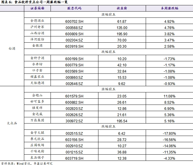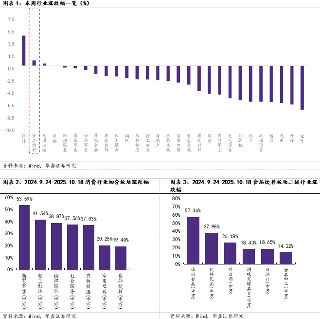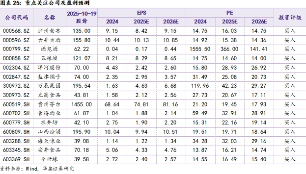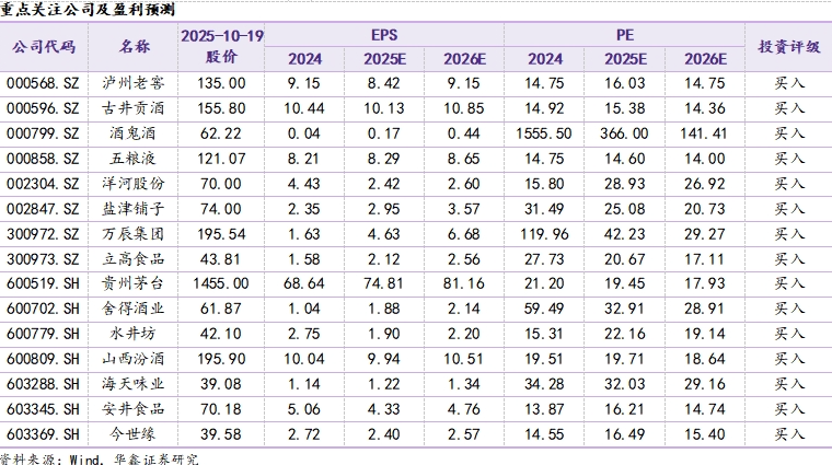 白酒板块:本周南京秋糖举办,整体反馈较为平淡。头部酒企参展热情较低,且品牌以开发酒为主,酒企端发力直播等销售模式加速消费者培育,费投进一步聚焦C端。渠道反馈目前动销延续双节趋势,渠道库存小幅去化,但仍处于相对高位,后续年末任务量压力下,预计批价趋势承压,酒企以控量挺价为主要任务。同时,白酒消费场景与价格带表现依旧分化,宴席与自饮场景相对刚性,政商务场景环比改善,但同比压力明显。整体来看,白酒需求仍在磨底阶段,建议关注具备长期配置价值的高股息龙头:贵州茅台、五粮液、泸州老窖、汾酒等,以及优先出清、回调到位的弹性个股:酒鬼酒、舍得酒业、今世缘、珍酒李渡等。