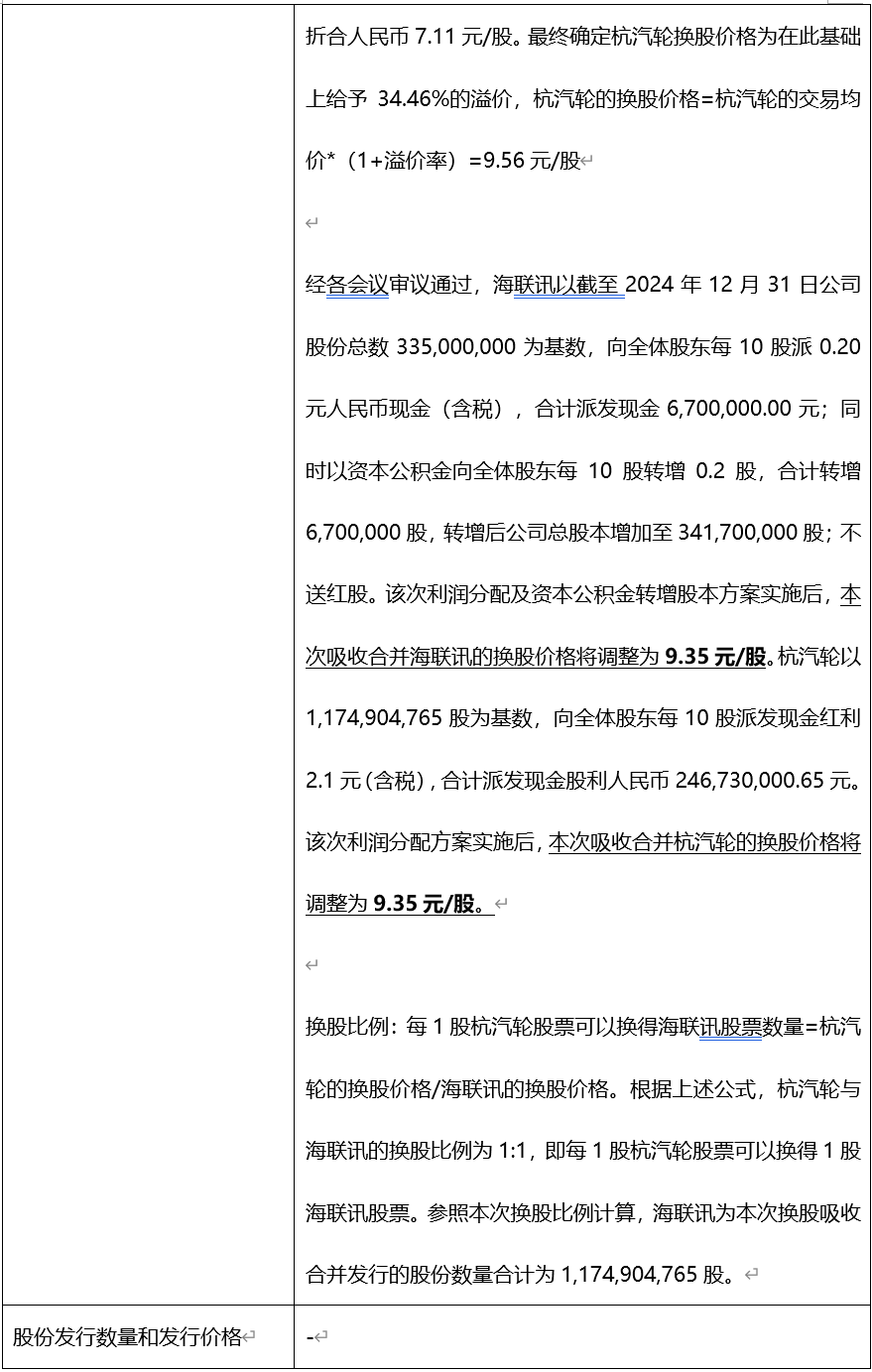 2025年9月26日,本案获中国证监会同意注册批复。本次交易,上市公司海联讯拟以向杭汽轮全体换股股东发行A股的方式换股吸收合并杭汽轮。海联讯为吸收合并方,杭汽轮为被吸收合并方,即海联讯向杭汽轮的全体换股股东发行A股股票,交换该等股东所持有的杭汽轮股票。交易作价112.32亿元。