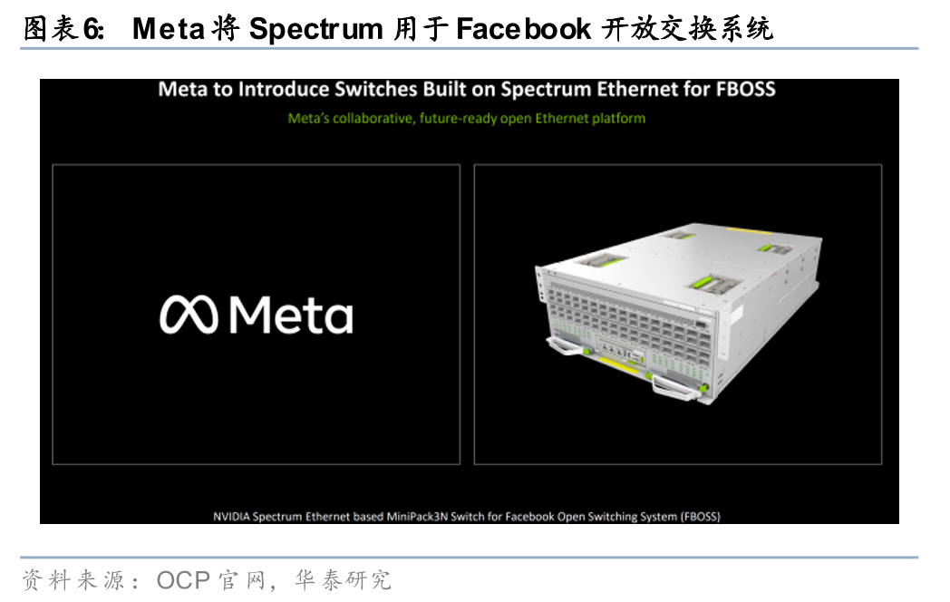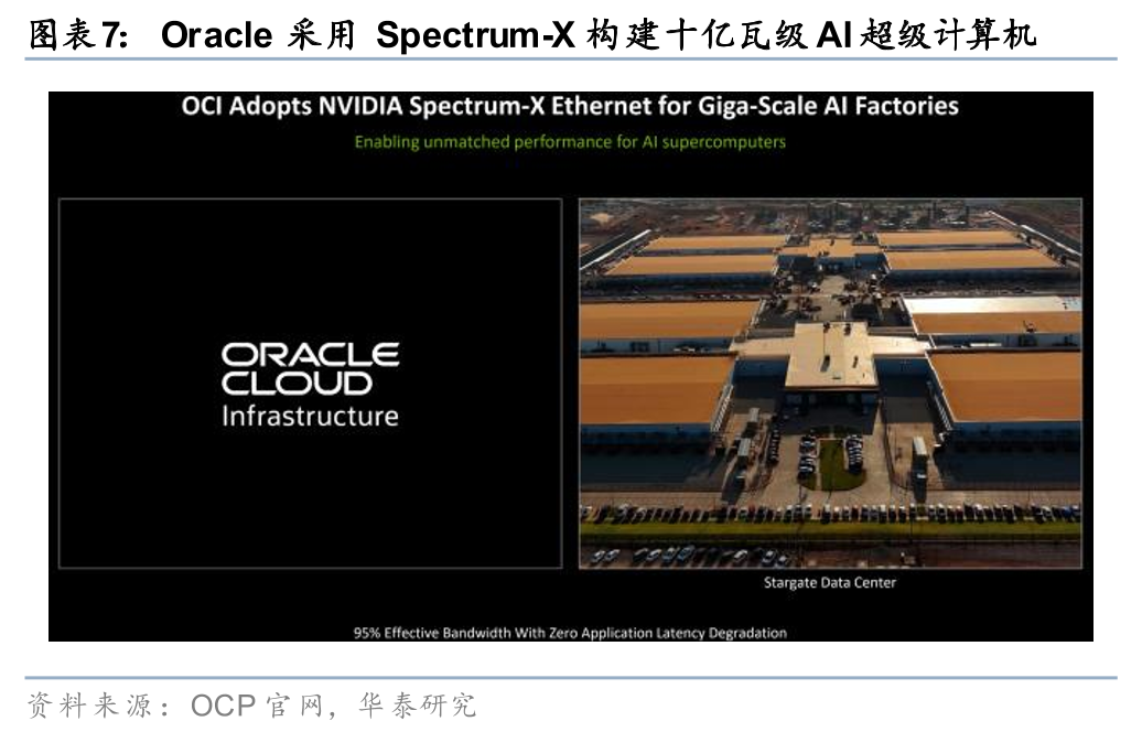 Meta、Oracle基于英伟达Spectrum-X以太网交换机升级AI数据中心网络,英伟达从GPU供应商成长为数据中心系统方案提供者。英伟达演讲指出,Meta推出基于英伟达Spectrum以太网的交换机,用于Facebook开放交换系统平台,Oracle采用Spectrum-X以太网交换机构建十亿瓦级(Giga-Scale)AI超级计算机。英伟达创始人兼CEO黄仁勋表示:“万亿参数模型正在将数据中心转变为十亿瓦AI工厂,Meta和Oracle等行业领导者正在将Spectrum-X以太网定义为推动这场产业变革的标准。Spectrum-X不仅是更快的以太网,更是AI工厂的神经系统,帮助超大规模企业将数百万个GPU连接到一起构建成一台巨型计算机,从而训练有史以来规模最大的模型。”