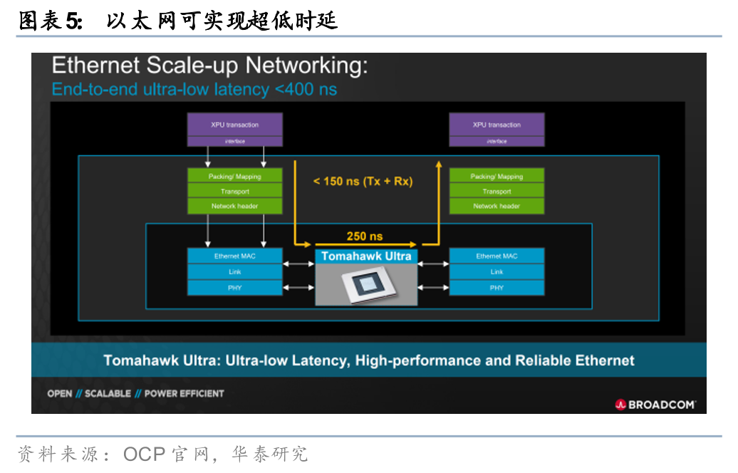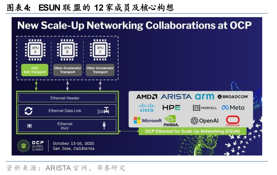 12家美国科技巨头组建ESUN联盟,致力于将以太网技术适配并升级至AI Scale-Up场景。ESUN联盟成员包括AMD、英伟达、博通等12家美国科技巨头,其本质是OCP框架下的开放式技术协作平台,集聚供应商和运营商,共同调整和利用以太网,使其能够满足AI Scale-Up的需求。ESUN联盟目前聚焦于四个领域:1)互操作性:该计划强调开发XPU网络接口和用于Scale-Up的以太网交换机ASIC的互操作性;2)技术焦点:初期的焦点将集中在L2/L3以太网帧结构和交换,以实现稳健、无损、抗错误的单跳和多跳拓扑;3)标准调整:ESUN将积极与UEC(超以太网联盟)和 IEEE 802.3(以太网)等组织合作,以对齐开放标准、加速创新;4)生态系统赋能:通过利用以太网成熟的硬件和软件生态系统,ESUN将鼓励多样化的实现方案,并推动该技术在整个行业中快速普及。我们认为,以太网拥有成熟的技术、完整的产业链,ESUN联盟基于通用标准,有助于打破专有协议的垄断,形成开放、多厂商兼容的生态优势,进一步推动AI产业发展,同时以太网向Scale up领域拓展的进程中或将催生光模块新需求。