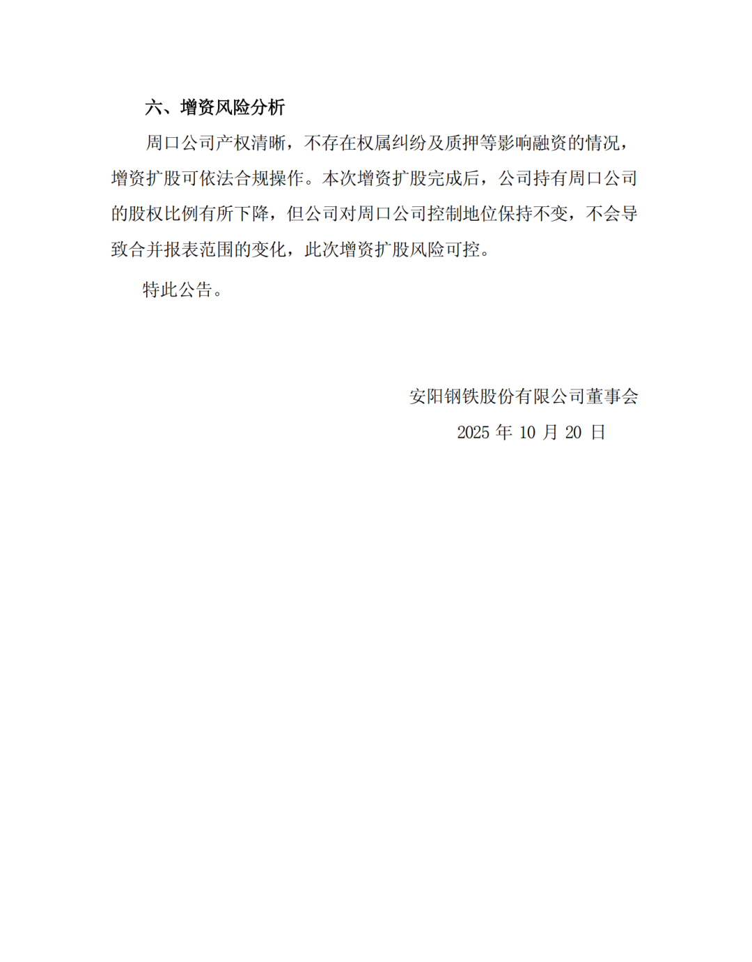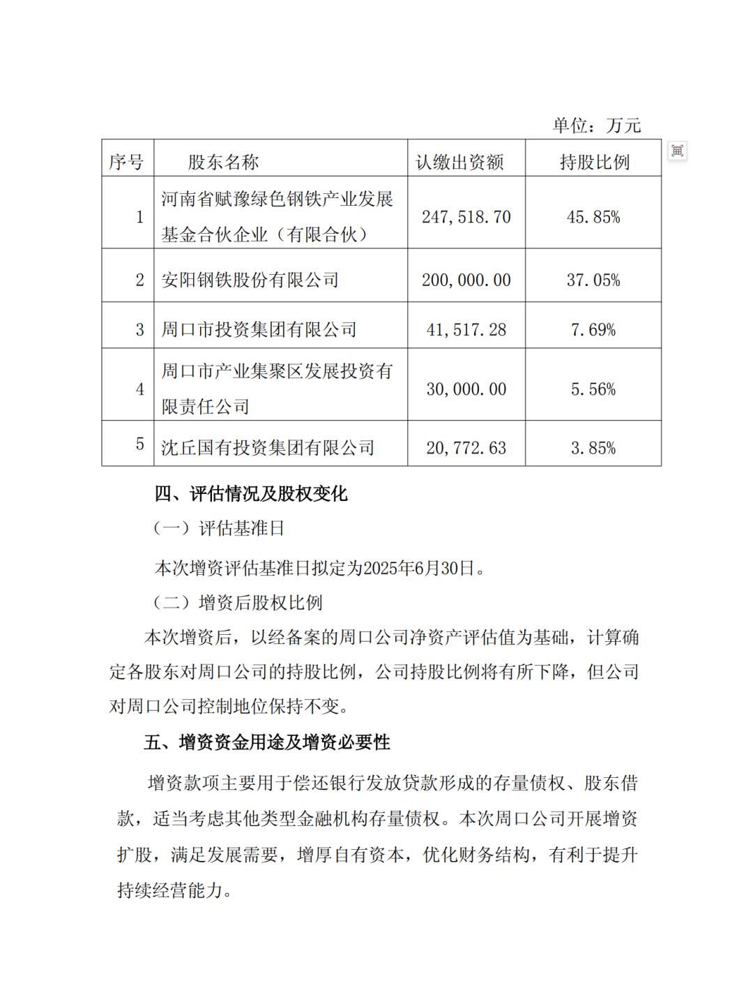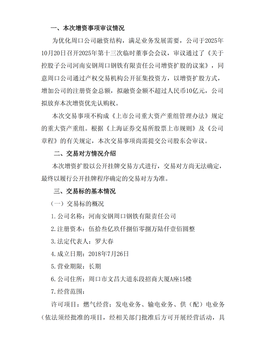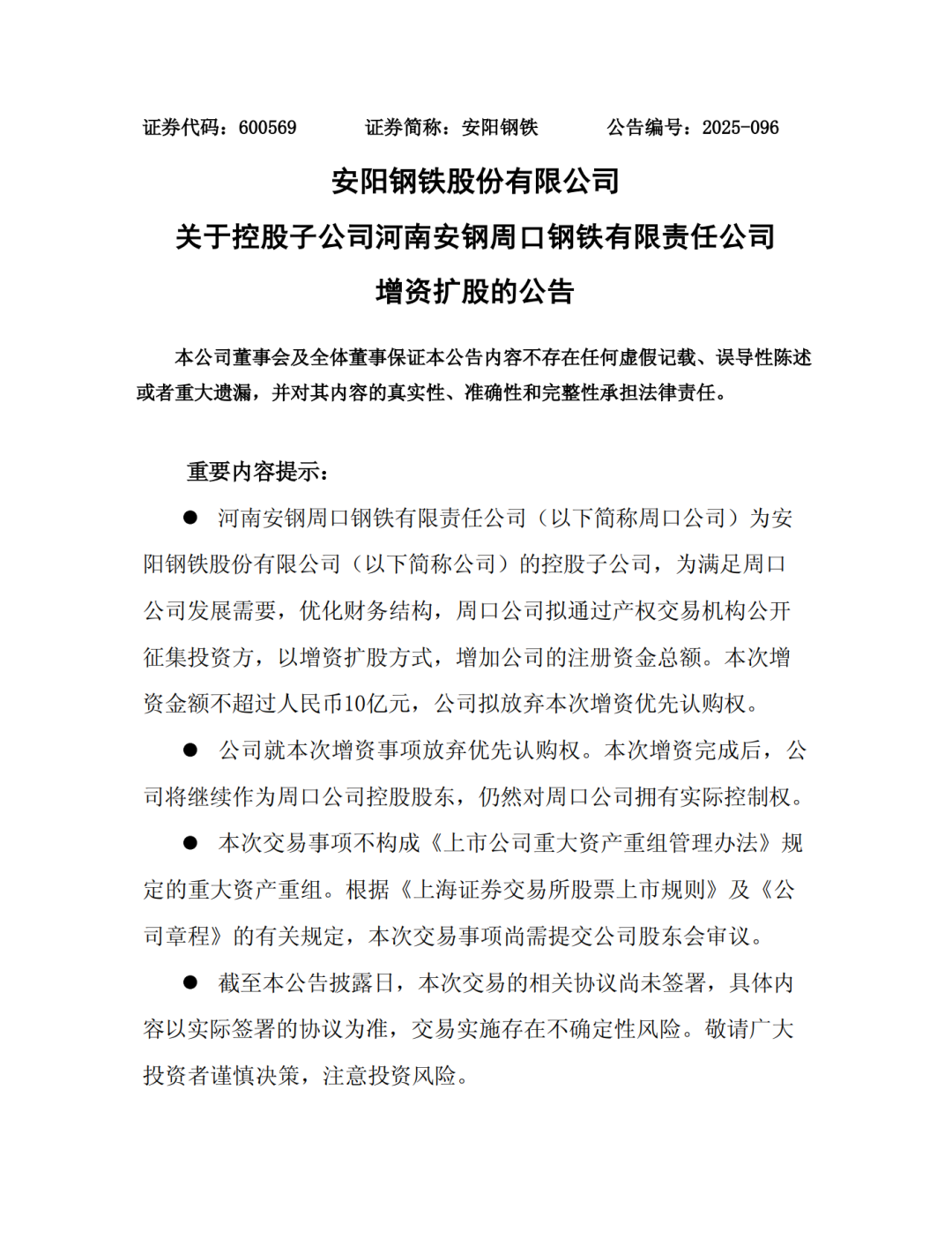 《安阳钢铁股份有限公司关于控股子公司河南安钢周口钢铁有限责任公司增资扩股的公告》显示:河南安钢周口钢铁有限责任公司为安阳钢铁股份有限公司(以下简称公司)的控股子公司,为满足周口公司发展需要,优化财务结构,周口公司拟通过产权交易机构公开征集投资方,以增资扩股方式,增加公司的注册资金总额。本次增资金额不超过人民币10亿元,公司拟放弃本次增资优先认购权。