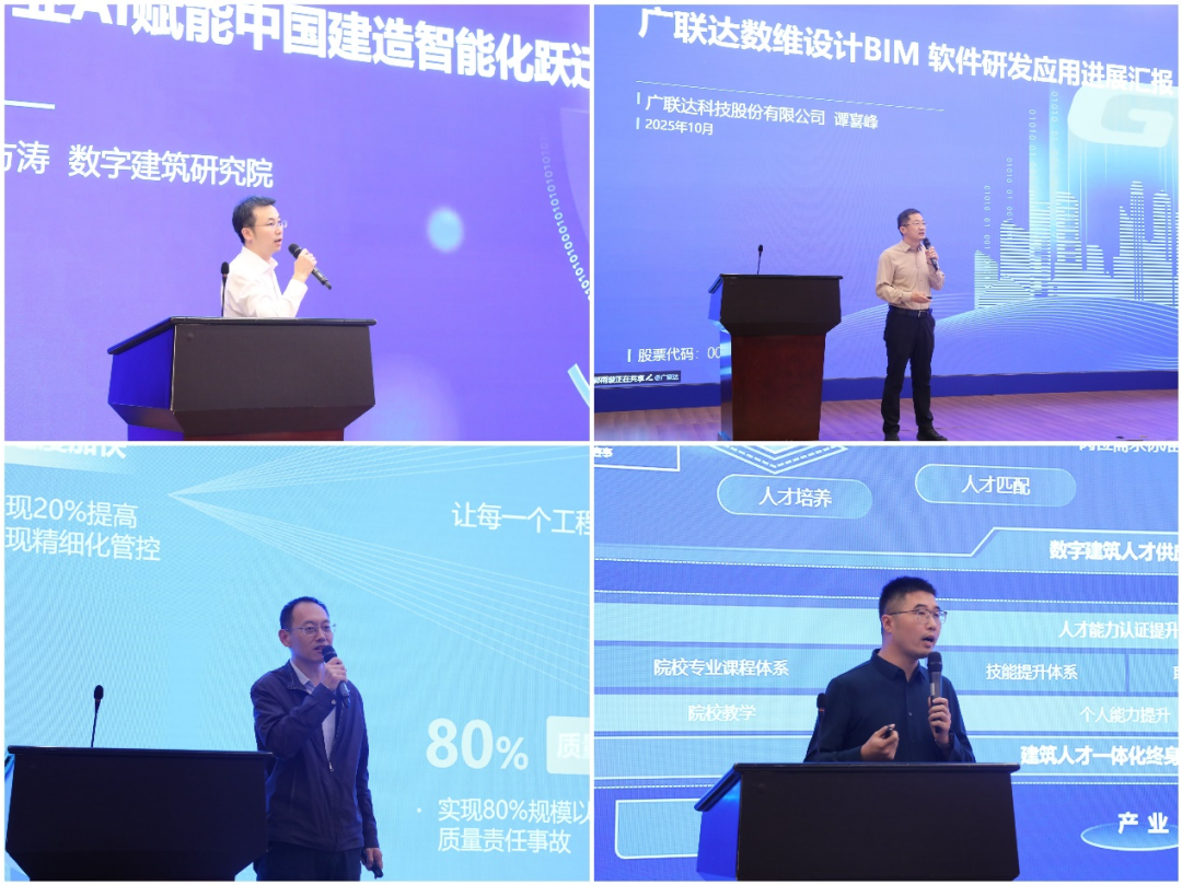 广联达助理总裁、房建BIM产品线副总经理谭喜峰,建筑能碳业务部总经理田淑明,数字教育BU施工人才服务产品部总监崔嘉晋,数字建筑研究院资深研究员胥方涛分别就数维设计BIM软件研发应用进展、广联达碳排放计量云平台、工程人才能力基建、产业AI赋能建筑行业高质量发展的实践探索等议题进行了专题介绍。