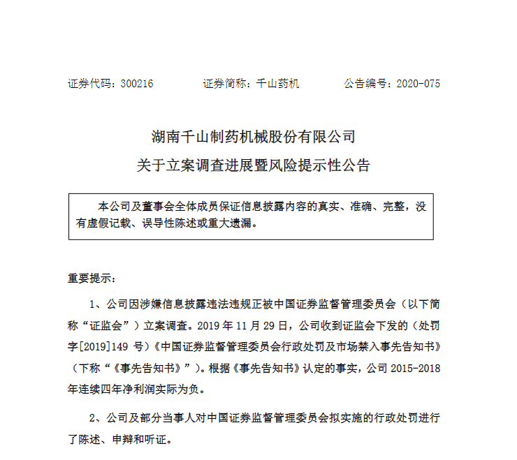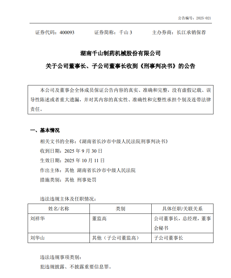 10月15日,曾被誉为“A股医疗器械第一股”千山制药机械股份有限公司发布一则重要公告,其公司董事长、总经理、董事会秘书刘祥华,以及子公司董事长刘华山收到湖南省长沙市中级人民法院作出的(2023)湘01刑初85号《刑事判决书》,二人分别被判刑两年,这一事件再度将这家曾经辉煌的医疗器械企业推至财经舆论的风口浪尖。