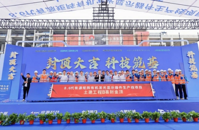 近日,合肥国显第8.6代有源矩阵有机发光显示器(AMOLED)生产线项目土建工程B标段顺利举行封顶仪式,项目全面封顶标志着土建施工取得关键阶段性成果,为后续高端设备安装及投产运营奠定坚实基础。