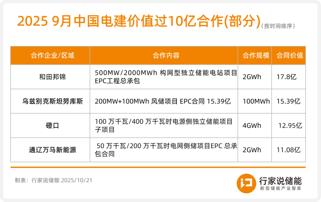 值得一提的是,在2025年9月新,中国电建新签合同金额在人民币10亿元以上的储能项目如下表。