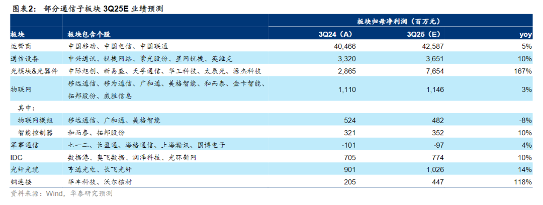预计 3Q25 通信板块合计归母净利润同比增长 15%,剔除三大运营商、中兴通讯权重股后,预计板块归母净利润同比增长 73%。细分来看,电信运营商利润预计稳健增长;光通信板块在海外与国内市场需求延续高增下,业绩有望持续兑现,且产业链景气度预计继续呈扩散趋势;IDC 受益国内外智算中心需求增长有望迎来拐点;铜连接板块业绩有望在产能释放下逐步兑现;光纤光缆景气度有望逐步复苏。