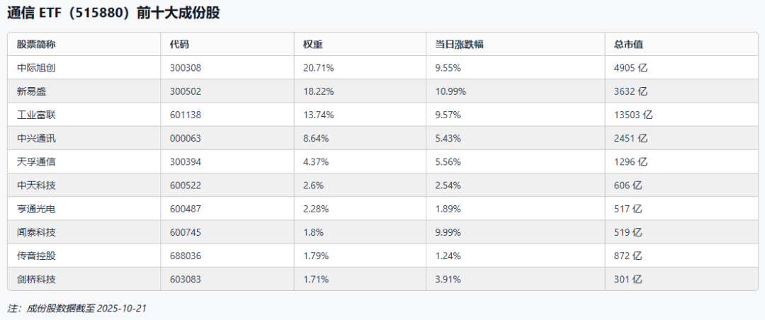 根据 ETF 查一查小程序数据,截至 2025 年10 月21 日15:00,国泰基金旗下的通信 ETF(代码:515880)盘中表现强劲,当日涨幅达 6.76%,成交额为 19.625 亿元,基金最新规模为 93.718 亿元,折溢价率为-0.07%。