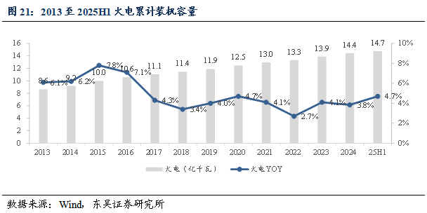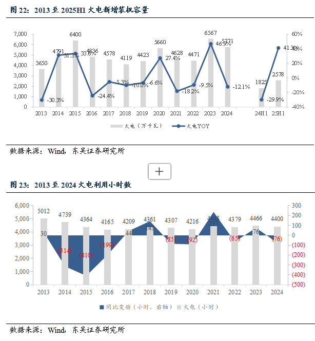 装机容量与利用小时数:截至2025年6月30日,中国火电累计装机容量达到14.7亿千瓦,同比提升4.7%。2025年1至6月,中国火电新增装机容量2578万千瓦,同比增长41.3%。2024年1至12月,中国火电利用小时数4400小时,同比下降76小时。