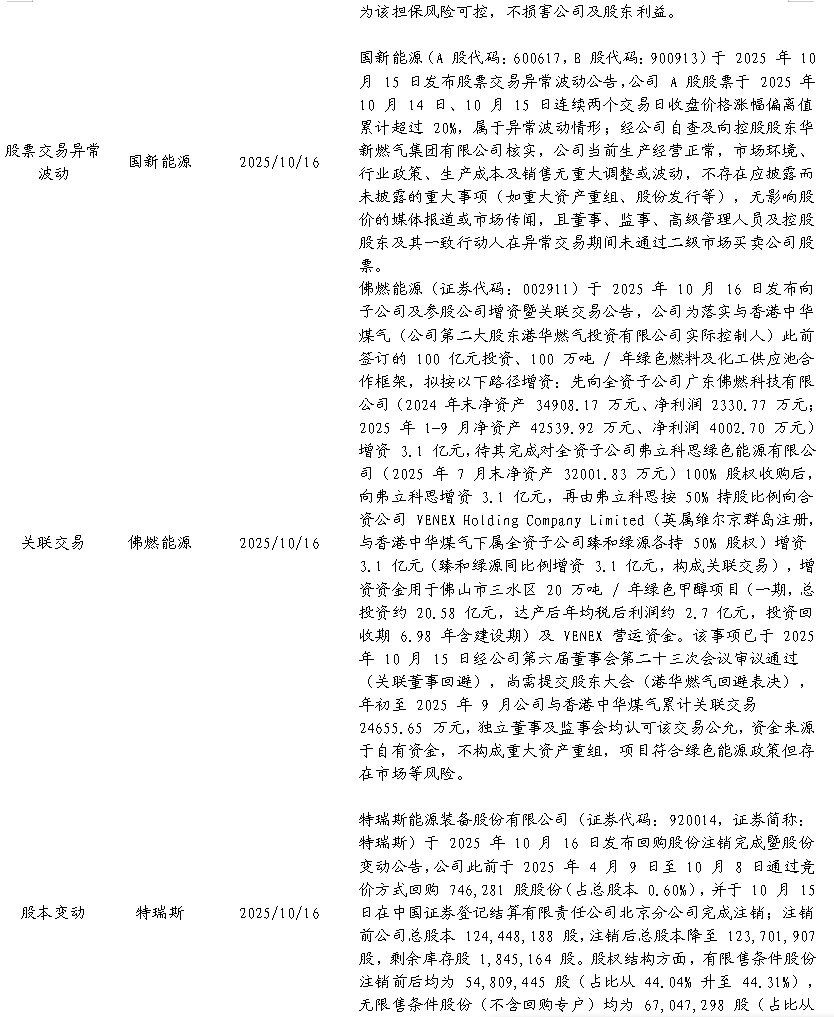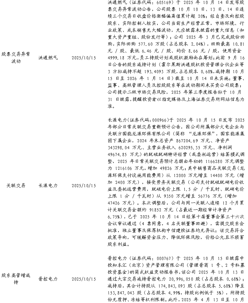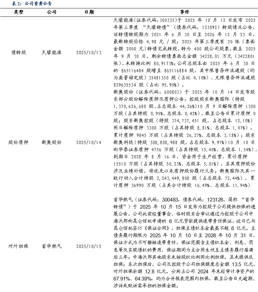 个股涨跌幅:本周(2025/10/13-2025/10/17),涨幅前五的标的为:国新能源(+28.6%)、中裕能源(+27.5%)、建投能源(+16.7%)、长春燃气(+16.6%)、穗恒运A(+10.7%)。跌幅前五的标的为:嘉泽新能(-17.2%)、北京燃气蓝天(-15.4%)、大众公用(-12.2%)、天富能源(-10.8%)、露笑科技(-9.4%)。