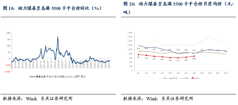 煤价:2025年10月17日,动力煤秦皇岛港5500卡平仓价为748元/吨,同比-10.95%,周环比上升39元/吨。2025年8月月均价为688元/吨,同比2024年8月下跌152元/吨,同比-18%。