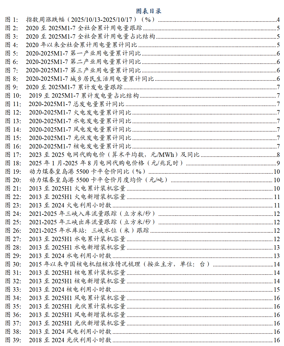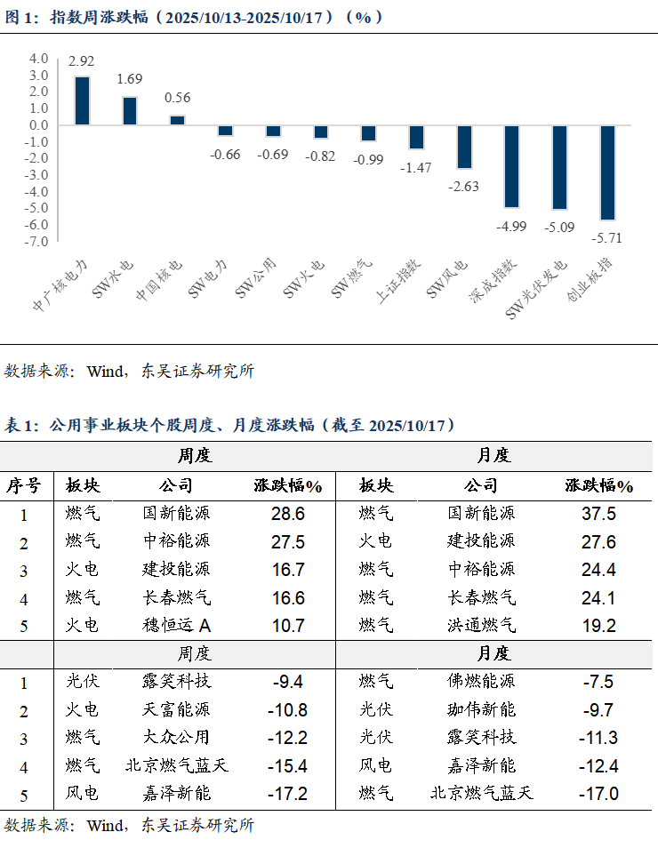 板块周行情:本周(2025/10/13-2025/10/17),SW公用指数下降0.69% ,显著跑赢创业板。从细分板块来看,SW火电(-0.82%)、核电(中广核电力2.92%,中国核电0.56%)、SW光伏发电(-5.09%)、SW风电(-2.63%)、SW燃气(-0.99%)、SW水电(1.69%)。