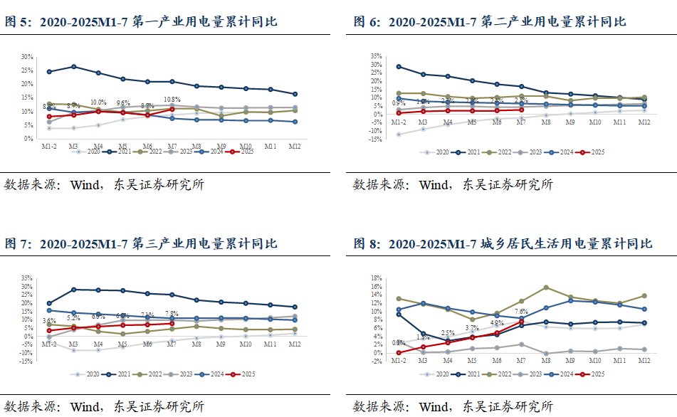 全社会用电量:2025M1-7全社会用电量5.86万亿千瓦时(同比+4.5%),同比增速较2025H1同比增速3.7%,提升0.8pct,其中,第一产业、第二产业、第三产业、居民城乡用电分别同比+10.8%(2025H1同比+8.7%)、+2.8%(2025H1同比+2.4%)、+7.8%(2025H1同比+7.1%)、+4.1%(2025H1同比+4.1%)。2025年用电量增速有所提升。