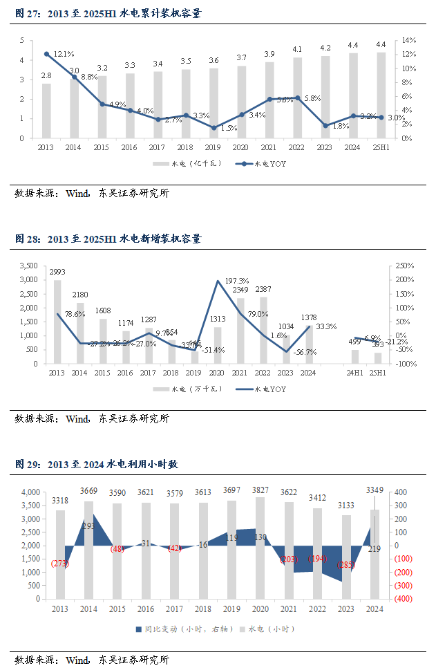 装机容量与利用小时数:截至6月30日,中国水电累计装机容量达到4.4亿千瓦,同比提升3.0%。2025年1至6月,中国水电新增装机容量393万千瓦,同比-21.2%。2024年1至12月,中国水电利用小时数3349小时,同比提升219小时。