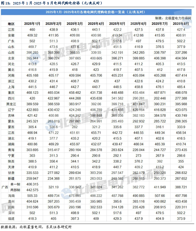 电网代购电价:2025年8月各省均价(算术平均数)388元/MWh,同比下降2%,环比上升1.3%。