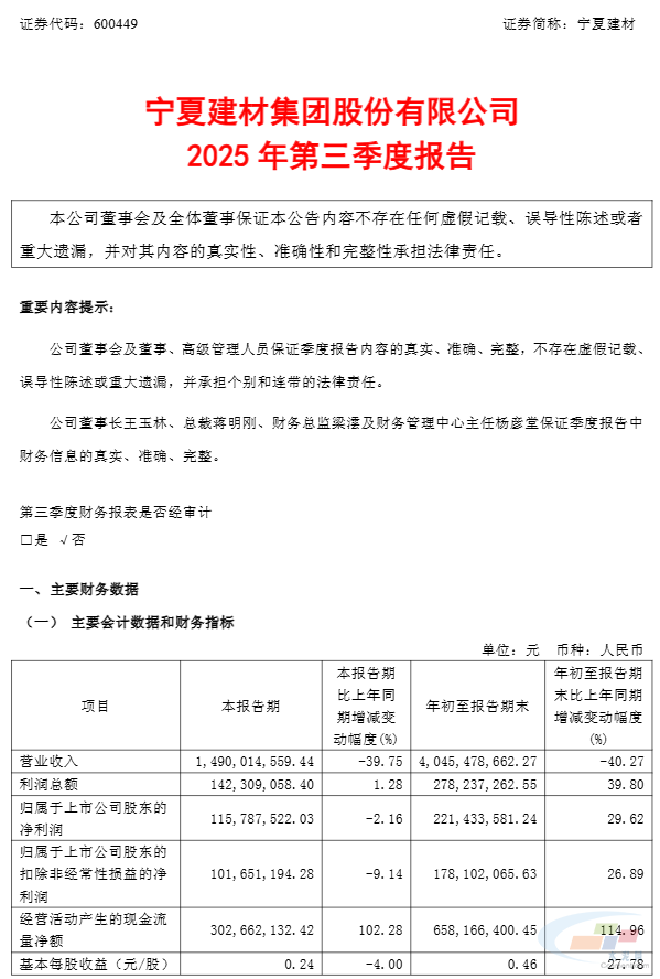 公司2025年前三季度营业收入40.45亿元,同比下降40.27%;净利润2.21亿元,同比增长29.62%;基本每股收益0.46元。