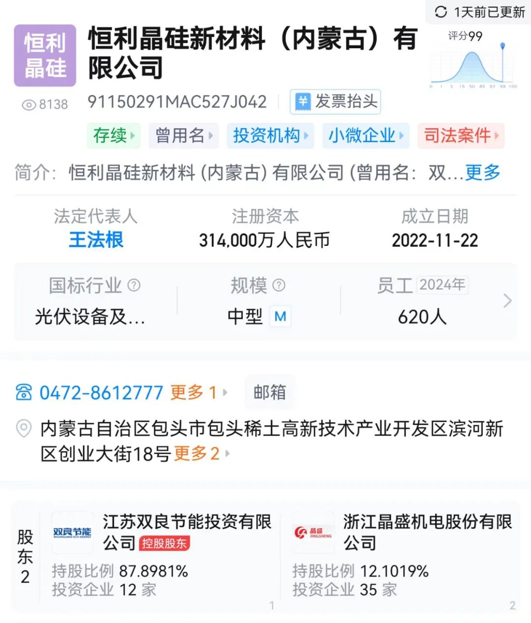 赶碳号今天在吃瓜群看到一张天眼查截图。图片显示,双良节能一家全资孙公司的股权发生重要变更——9月30日,晶盛机电以增资的方式成为其股东,持股比例12.1019%。