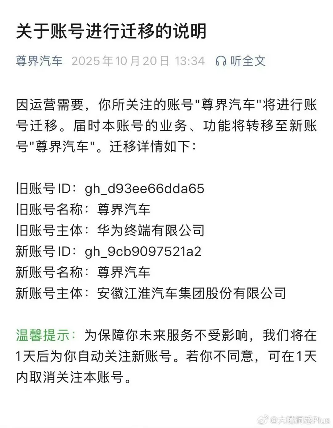 内容中官方表示:因运营需要,你所关注的账号“尊界汽车”将进行账号迁移。届时本账号的业务、功能将转移至新账号“尊界汽车”。从迁移详情来看,“尊界汽车”公众号迁移后主体发生了变化,原“尊界汽车”公众号主体是华为终端有限公司,而新账号主体是安徽江淮汽车集团股份有限公司。