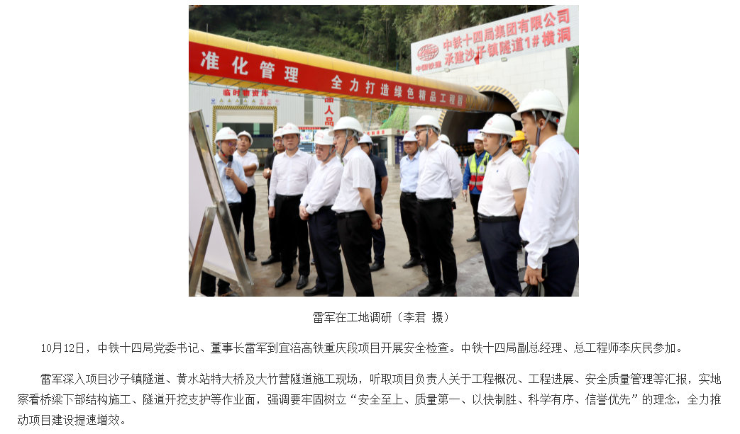 据中铁十四局公众号发布:10月12日,中铁十四局党委书记、董事长雷军到宜涪高铁重庆段项目开展安全检查。中铁十四局副总经理、总工程师李庆民参加。