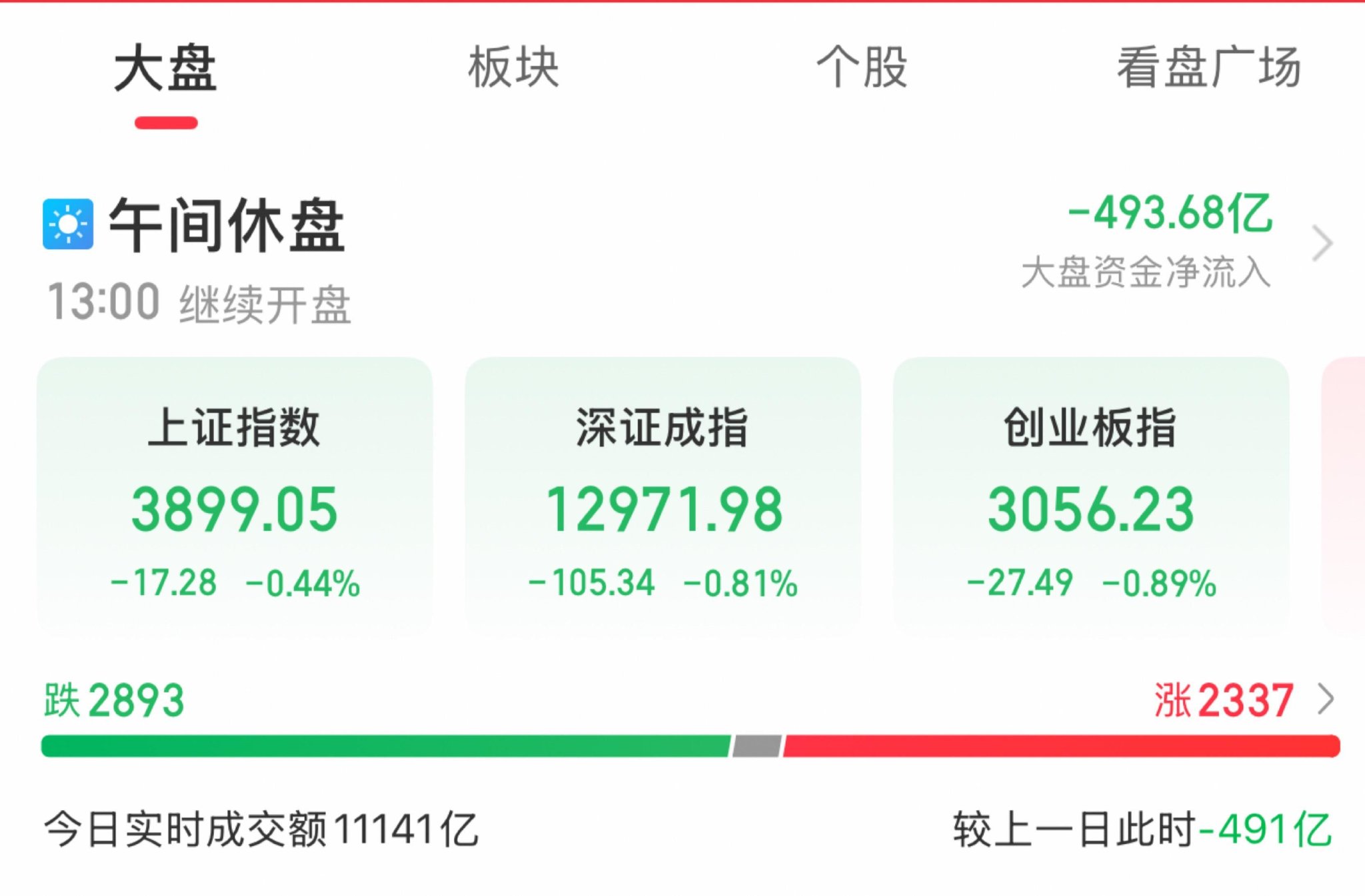 A股三大指数早盘集体下跌,截至午盘,上证指数跌0.44%,深成指跌0.81%,创业板指跌0.89%,北证50涨1.19%。沪深京三市半日成交额11141亿元,较上日缩量491亿元。全市场超2800只个股下跌。