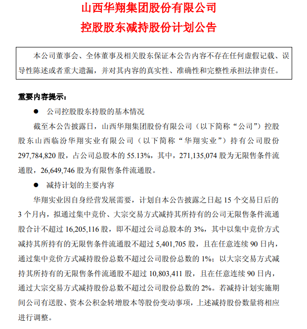 10月21日,华翔股份(603112.SH)发布公告,公司控股股东华翔实业因自身经营发展需要,计划自公告披露之日起15个交易日后的3个月内,拟通过集中竞价、大宗交易方式减持其所持有的公司无限售条件流通股合计不超过1620.51万股,即不超过公司总股本的3%。