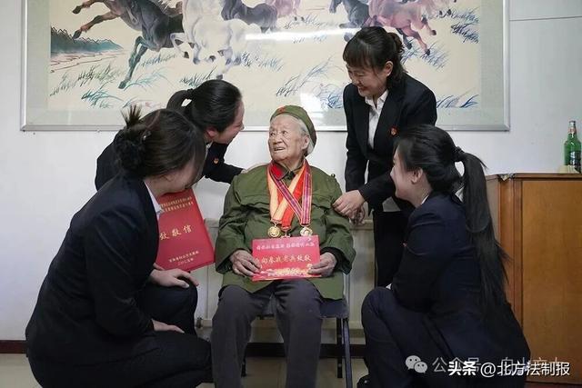 在98岁高龄的巾帼英雄陈茂芳家中,党员、团员青年们详细了解陈老的晚年生活,认真聆听陈老在战场上屡建功绩的感人故事,陈老还向大家展示出珍藏的军功章和珍贵的历史照片。这位从战火硝烟中走来的女战士用一生诠释着“铿锵玫瑰”的英雄本色。