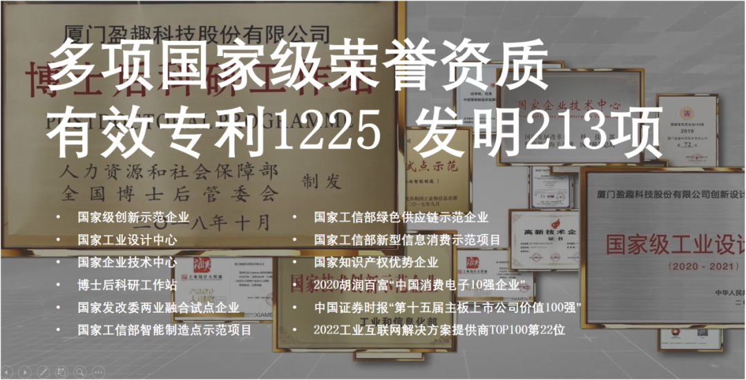 厦门盈趣科技股份有限公司(股票代码002925)致力于成为“工业互联网”与“民用物联网”领域领军企业,以自主创新的UDM模式(UMS联合管理系统+ODM智能制造体系)为基础,为客户提供智能控制部件、创新消费电子、健康环境及汽车电子等产品的研发、生产,并提供智能制造解决方案助力行业数字化转型发展。公司拥有60多家境内外全资或控股子公司,并荣获“国家技术创新示范企业”、“国家级企业技术中心”、“国家级工业设计中心”、“博士后科研工作站”、工信部“国家绿色制造示范企业”、“国家知识产权优势企业”等多项荣誉及国家创新平台,并荣获“2020胡润中国10强消费电子企业”、2023、2024连续两年荣获“胡润中国元宇宙企业榜TOP50”等奖项。